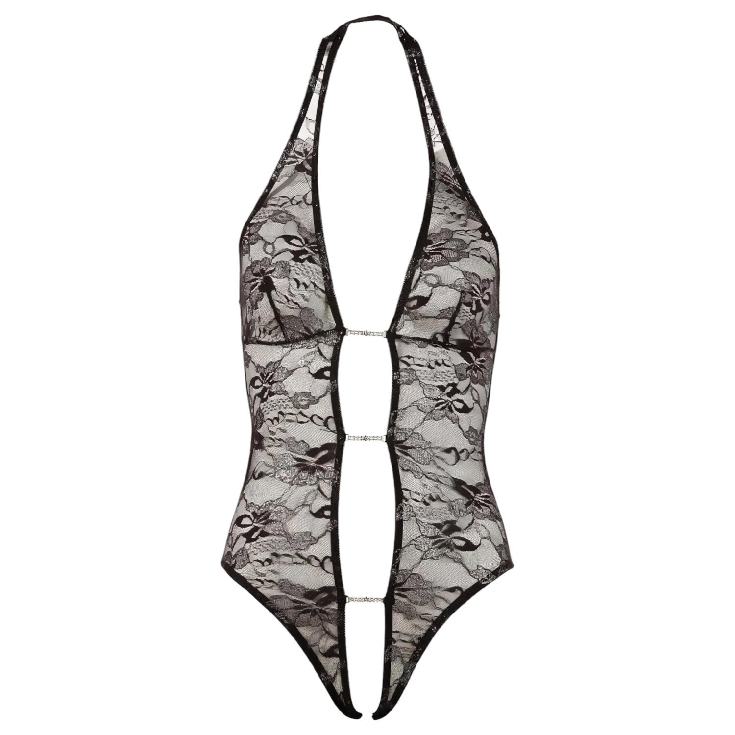 Julge sära pitskeha on ideaalne valik naistele, kes armastavad julget ja nõudlikku välimust. See eriline pesu on nagu eksklusiivne ehe: must lilleline pitskangas on kaunistatud hõbedaselt säravate niitide ja kivikeste detailidega, mis muudavad selle veelgi seksikamaks. Kaelusega lõige rõhutab elegantselt õlgu ja dekolteed, samas kui taga on läbipaistev, elastne materjal õrnalt su kehakuju järgimas. Eespool ühendavad vaid mõned säravad ehted materjali - tulemuseks on vapustav ja ülimalt seksikas välimus.
