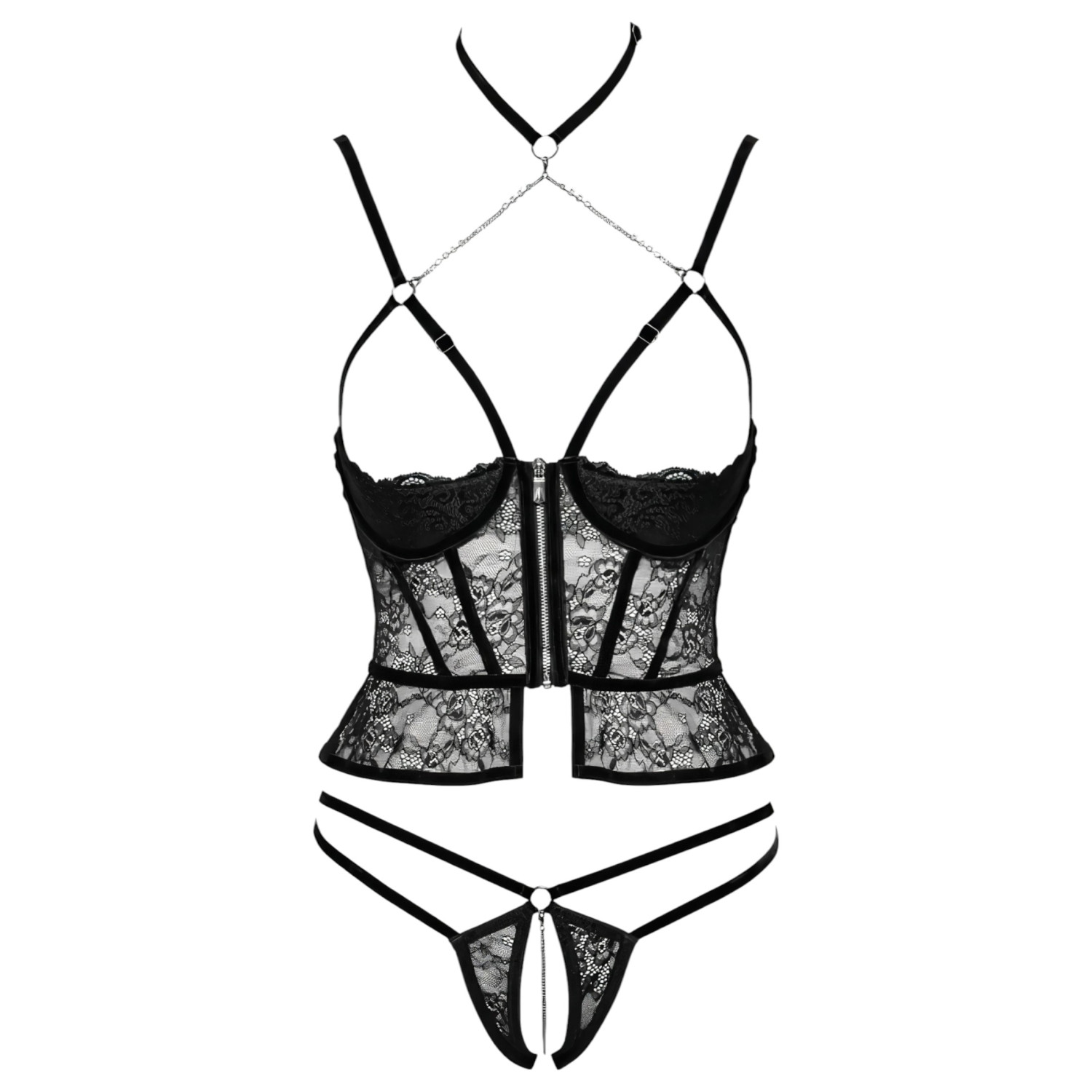 See eriline komplekt ühendab romantilise pitsi elegantsi julgete, erootiliste detailidega. Rinnahoidjaga korsett ja keti kaunistustega pentsik stringipaar on igaks sündmuseks unustamatu valik.