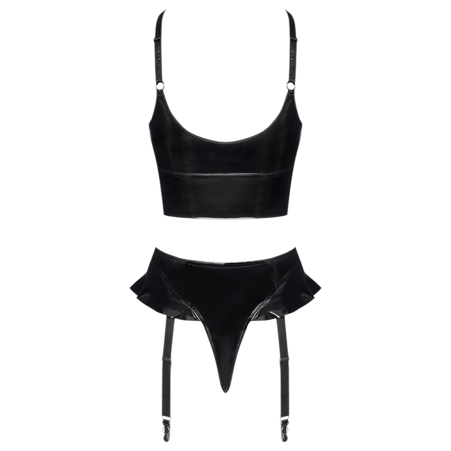 Black Level vinüülkomplekt on tõeliselt julge, läikiv ja seksikas pesu, mis toob suurepäraselt esile naiselikud kumerused ja annab palju enesekindlust. Lühike topp koos reguleeritavate, eemaldatavate sukahoidjarihmadega pakub mugavust ja stiilsust samal ajal. Eesmine tõmblukk ja sügav dekoltee muudavad komplekti ainulaadseks ja kütkestavalt vallatuks.