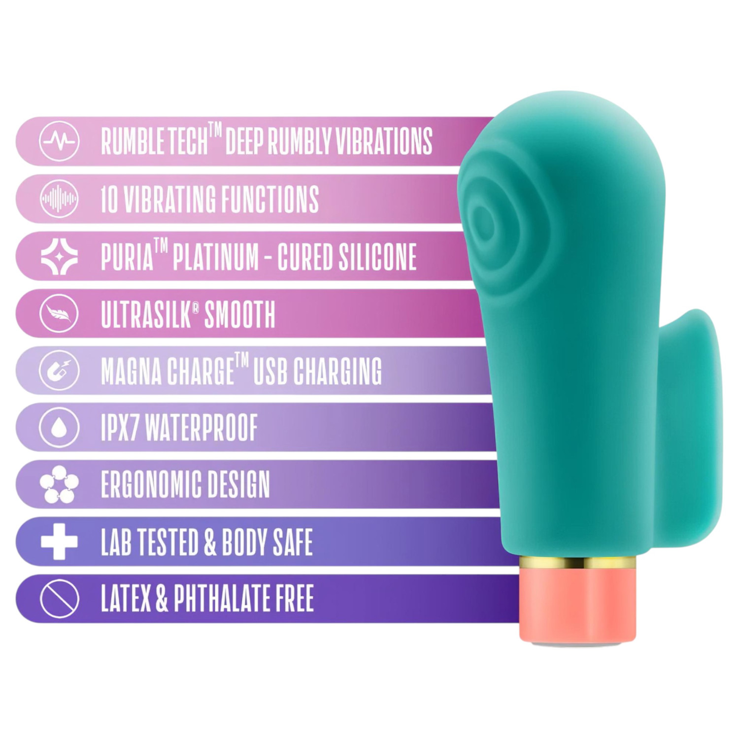Blush Aria - stimuleeriv sõrmevibraator on ideaalne valik kõigile, kes soovivad intensiivset, kuid samas siidiselt pehmet kogemust. Rumble Tech™ tehnoloogia pakub sügavaid, mürisevaid vibratsioone, mis annavad stimulatsioonile uue tähenduse. Ideaalne nii enesepagamiseks kui ka paarismänguks - kõikjal kehal!