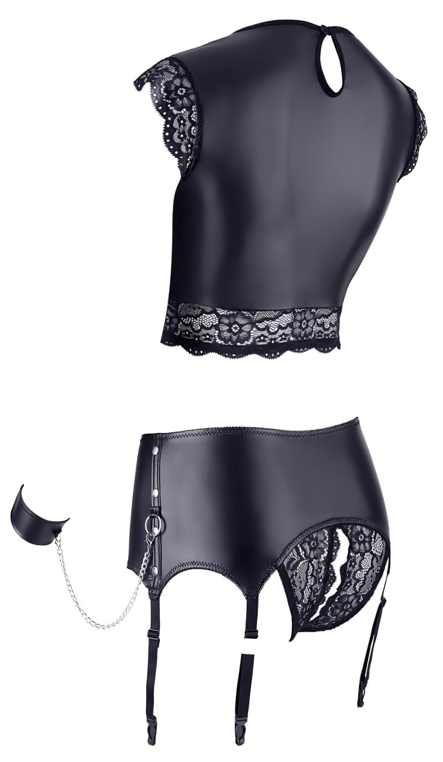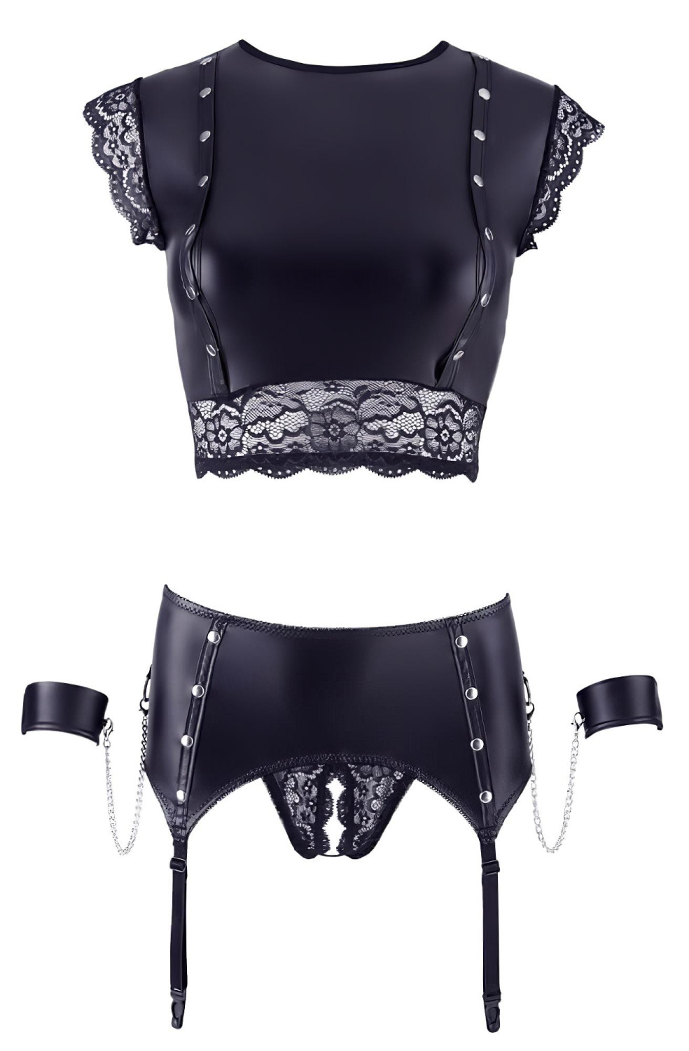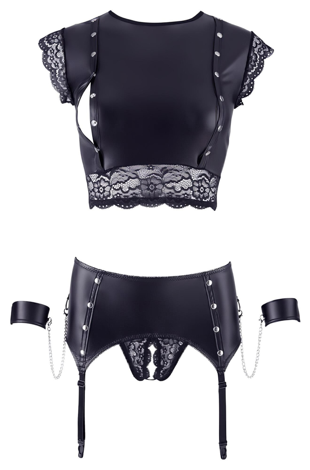 • Põnevad lisatarvikud: Metallrõngad, needid ja ketid ei kaunista ainult komplekti, vaid pakuvad võimalust loovateks ja kirglikeks hetkedeks koos.