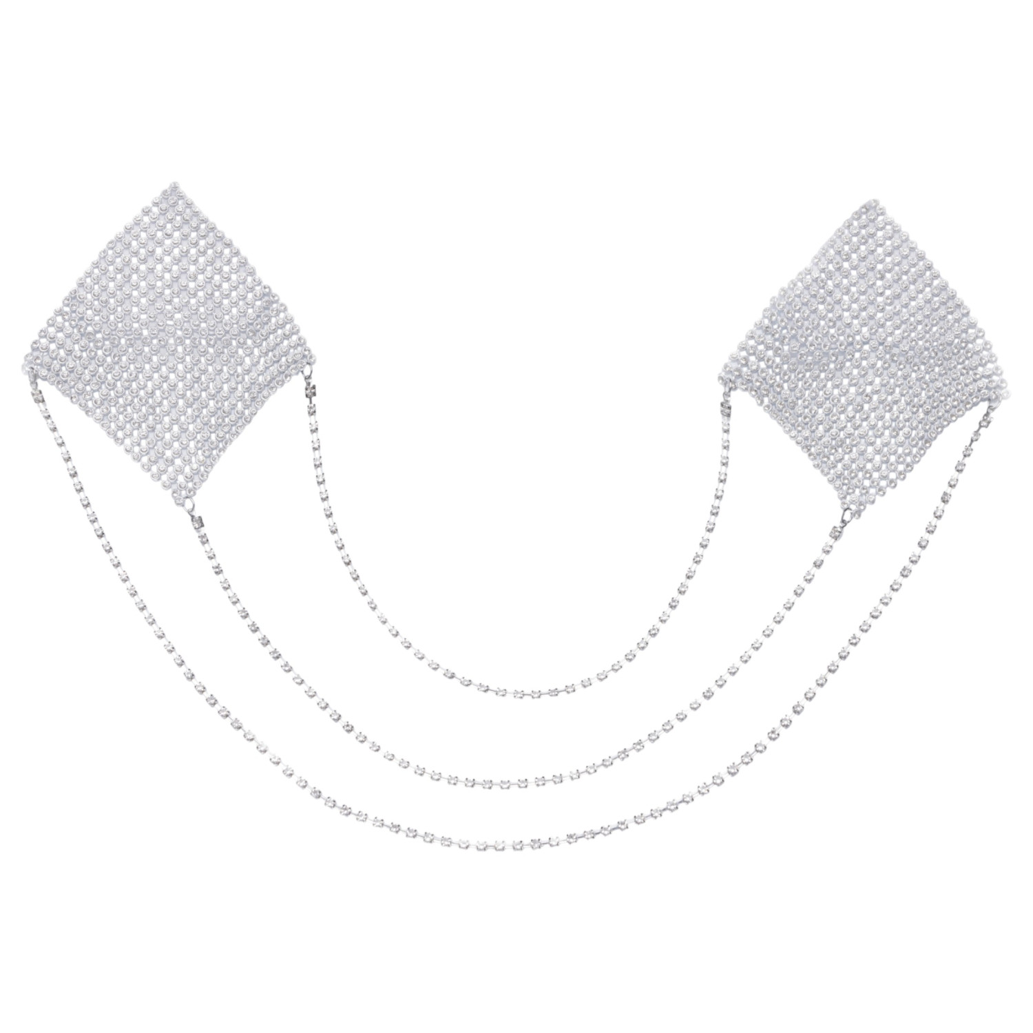 See silmapaistev, teemantkuju imiteeriv rinnanibukleebis paistab oma läikiva hõbedase värviga ja on kaunistatud kolme liikuva ketiga, mis järgnevad põnevalt igale liigutusele. Nahasõbralik bio-adhesiivne liim tagab mugava kandmise ning kleebiseid saab korduvalt kasutada, kui kaitsekile iga kasutuskorra järel tagasi panna. Elegantne ja julge lisand pesule, eelmänguks või laval esinemiseks.