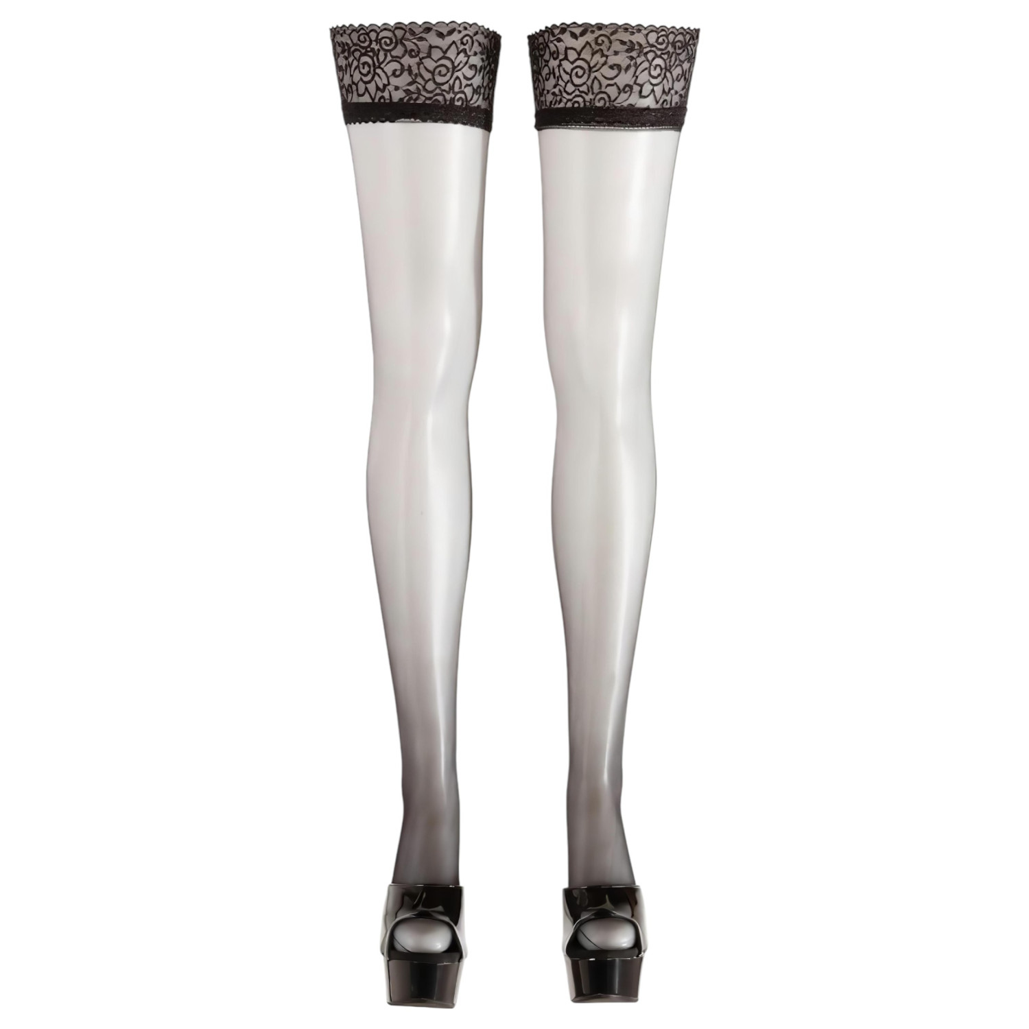 Läbipaistev, reieni ulatuv naistesukk laia pitsist äärega.