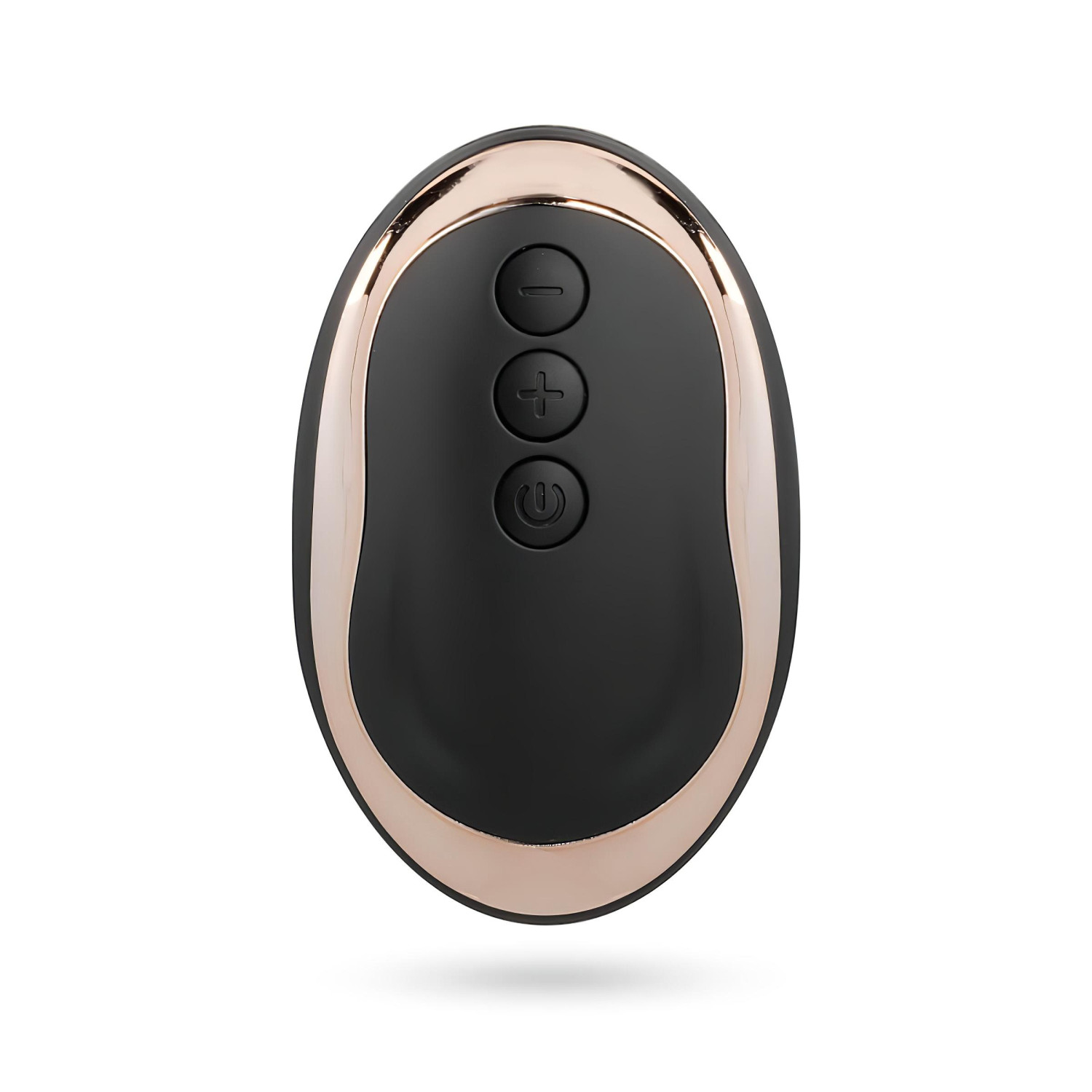 • Raadiosagedusega vibratsioonimuna: tugev alus, nahasõbralik silikoon, 10 vibratsioonirežiimi, USB-laetav aku, must, kuldsed läiked.