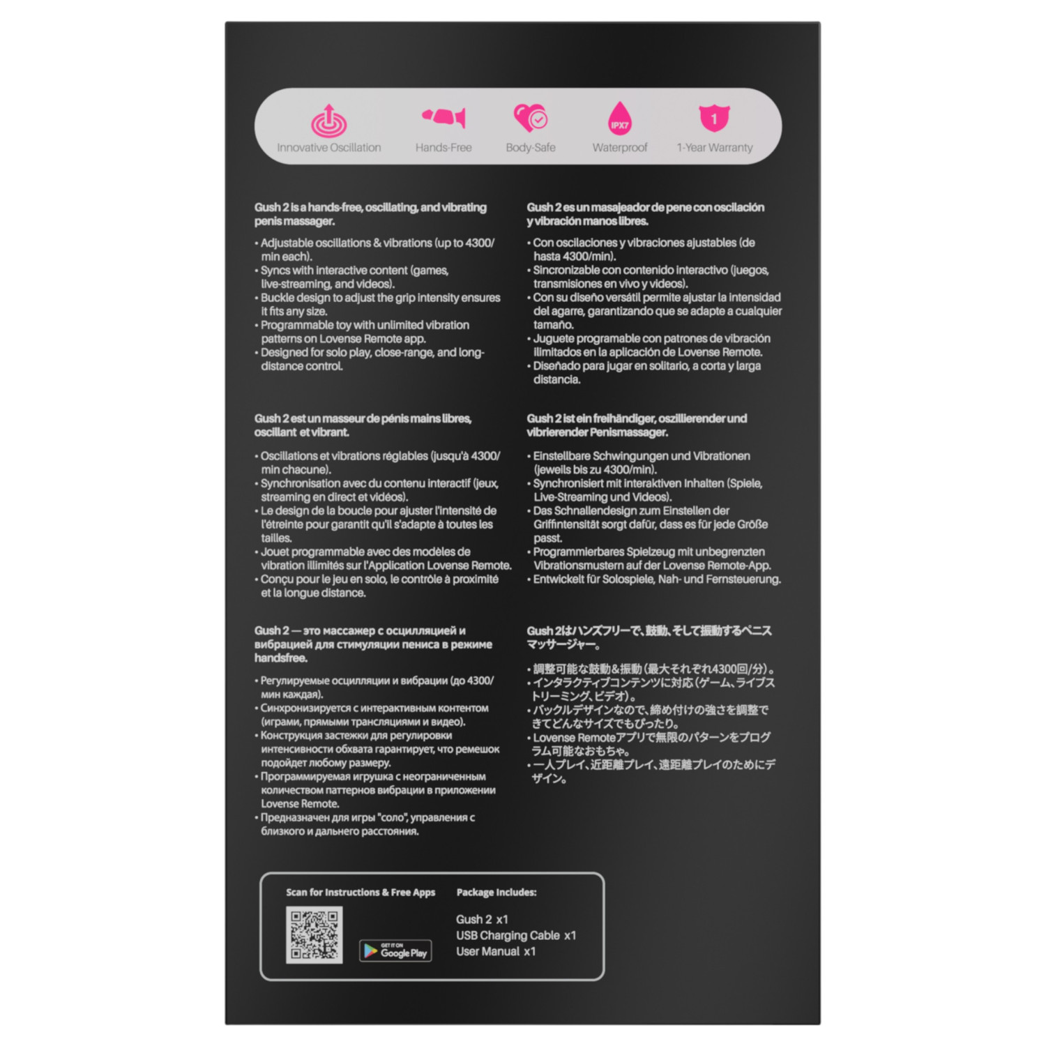 • Paindlik ja reguleeritav disain: Gush 2 sobitub erinevate suuruste ja eelistustega, võimaldades nii käed-vaba kasutust kui käsitsi kontrolli, kui tahad veelgi intensiivsemat stimulatsiooni.