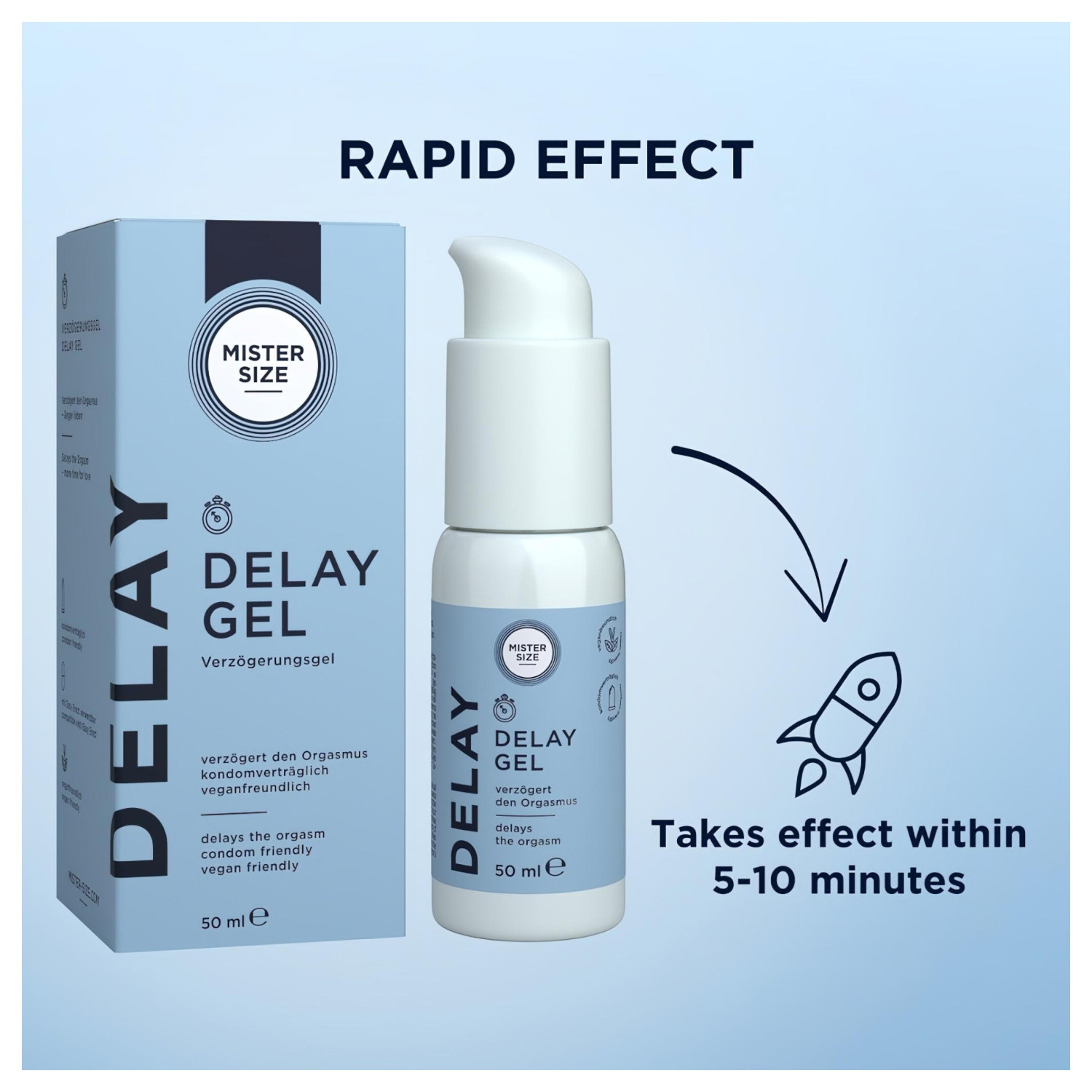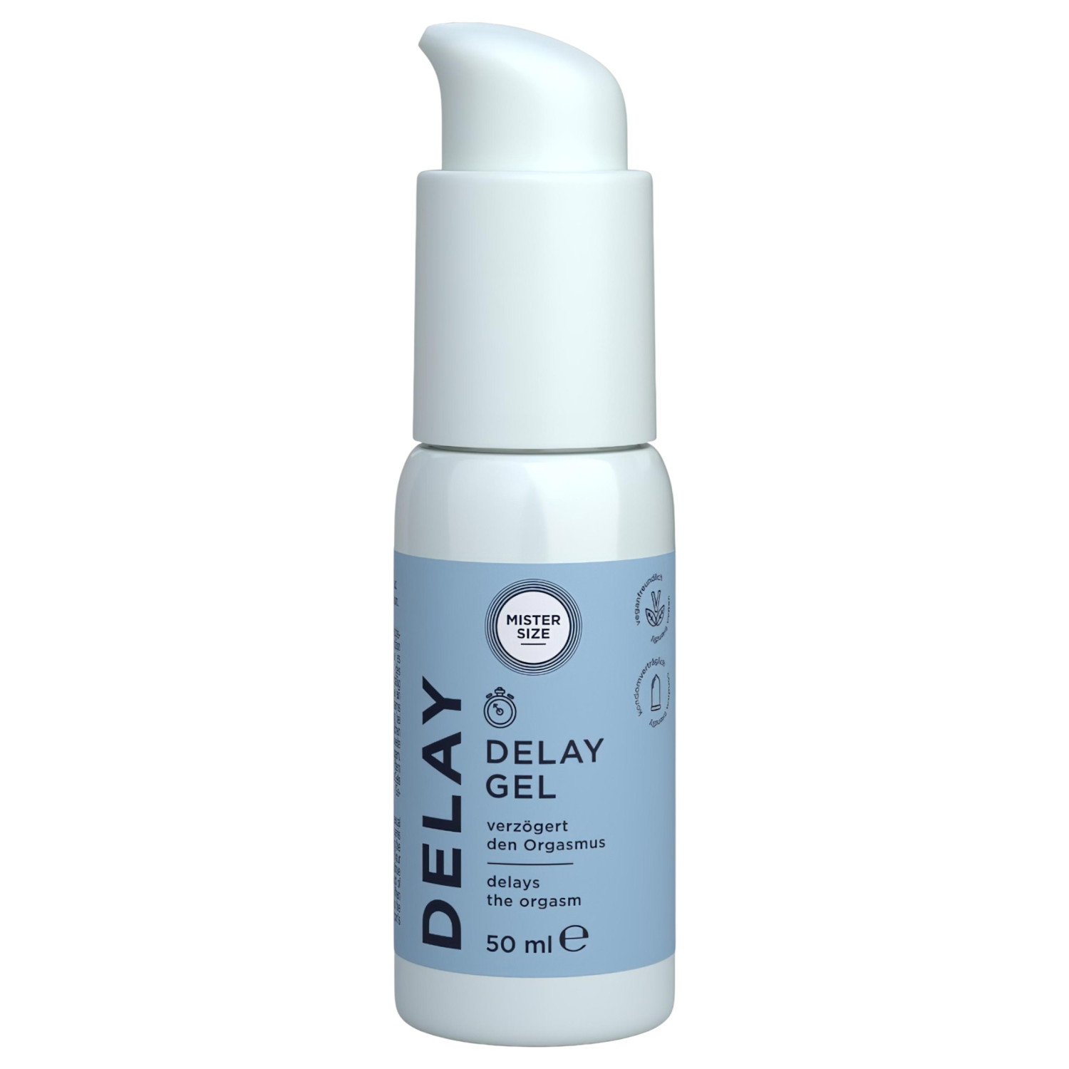 Mister Size viivitav geel on spetsiaalselt meestele loodud, et pikendada koosolemise naudingut ilma tundlikkust ja naudingut ohverdamata. Selle looduslikud koostisosad, nagu nelgiõli ja laureth-9, vähendavad õrnalt tundlikkust, aidates seega kontrollida enneaegset ejakulatsiooni. Jahutav efekt suurendab kontrolli, samal ajal kui naistepuna- ja kaeraekstrakt rahustavad ja hooldavad nahka.