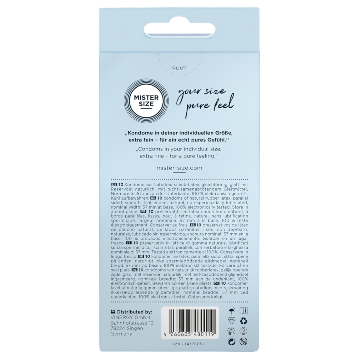 • 10 Mister Size 57 mm ultraõhukest määrdeainega kondoomi, kõik eraldi pakitud.
