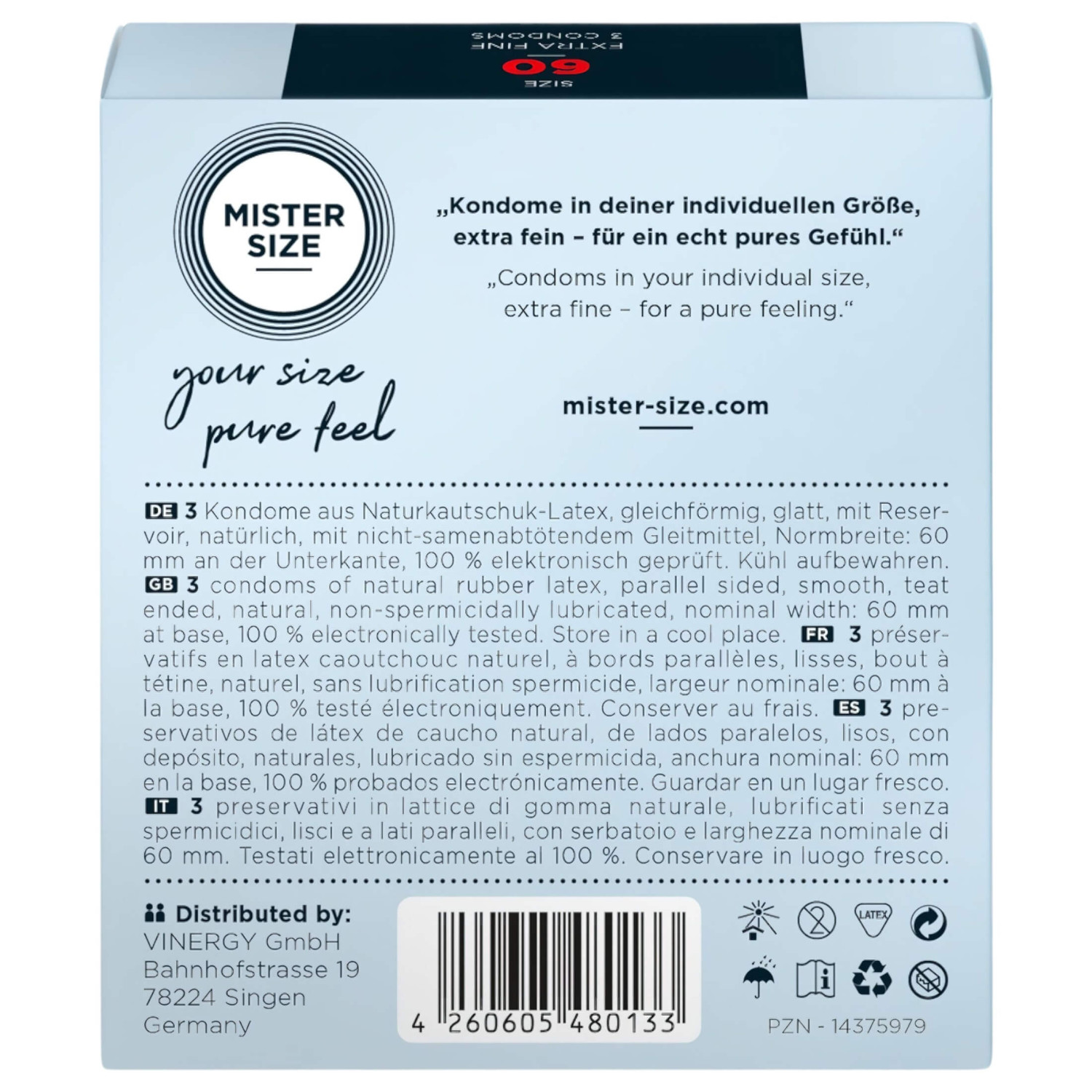 • 3 Mister Size 60 mm üliõhukest, eelniisutatud kondoomi eraldi pakendites.