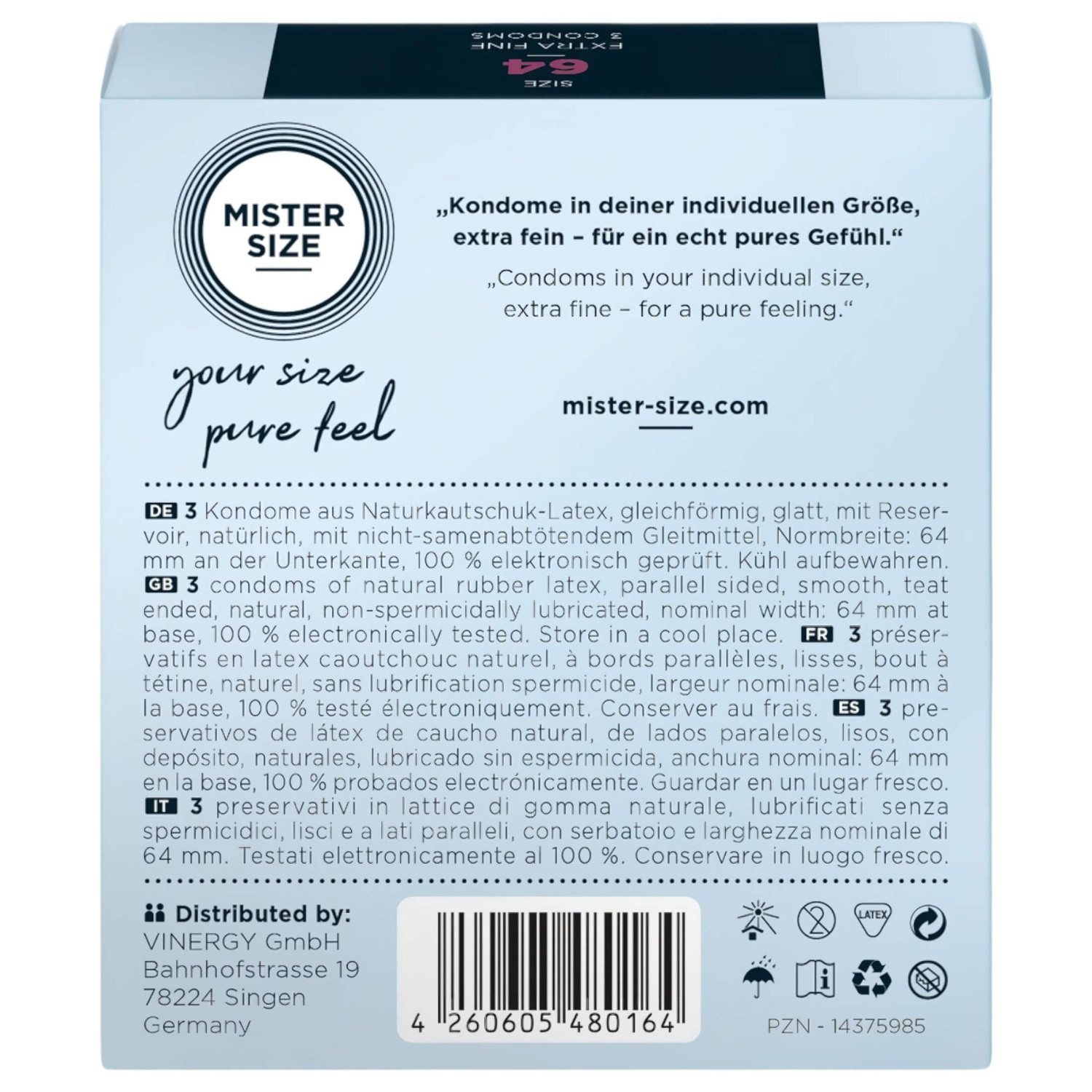 • 3 Mister Size 64 mm ultrapeenikest, määrdeainega kondoomi, eraldi pakitud.