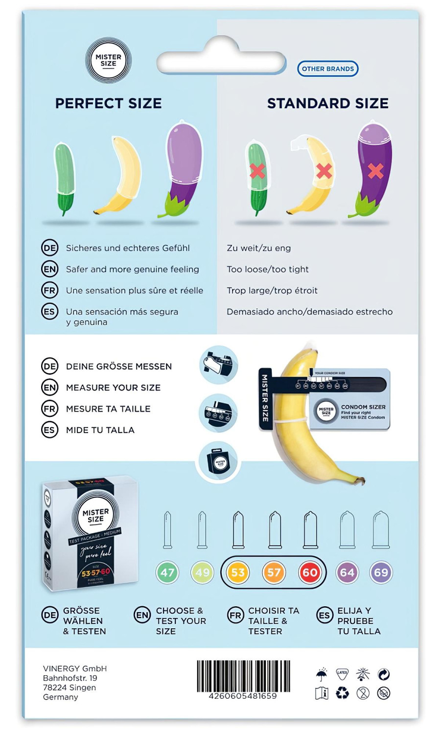 • 1 Mister Size kondoom - 60 mm laiusega (13,5-14,5 cm ümbermõõdule)