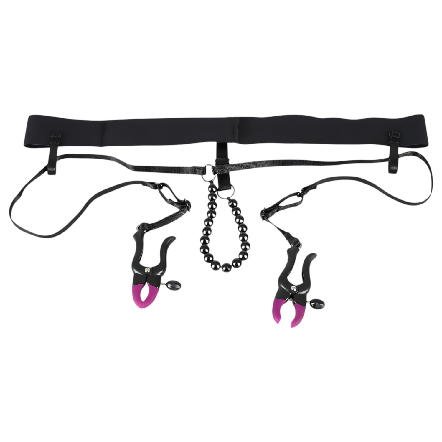 Avasta uuele naudingutasemele selle musta laialihoidva rihmaga, millel on häbememoka-klambrid ja kliitorit stimuleerivad pärlid.