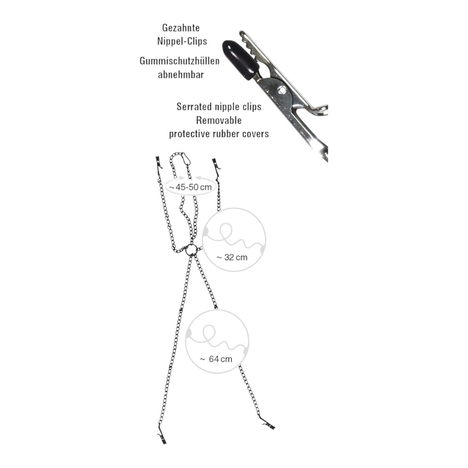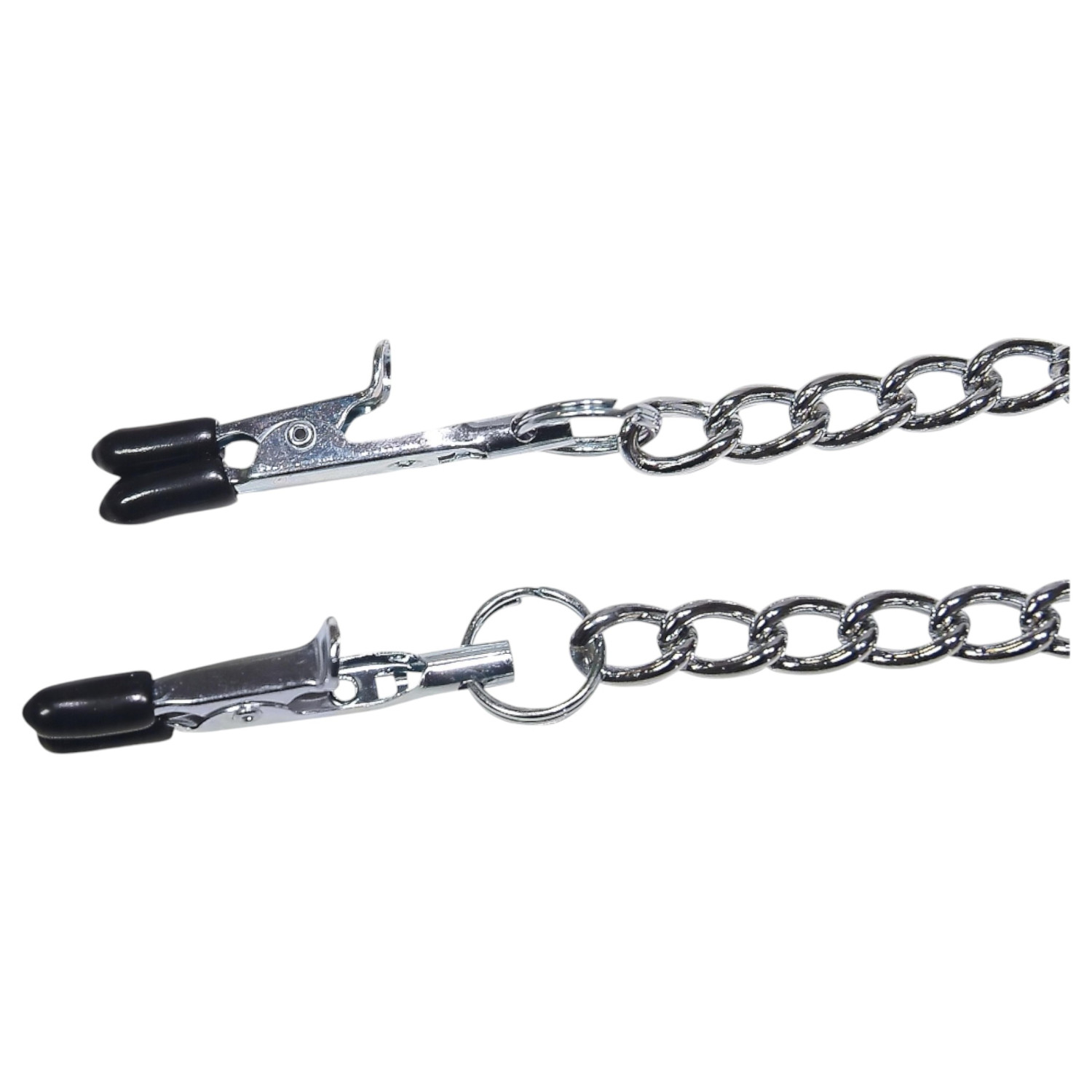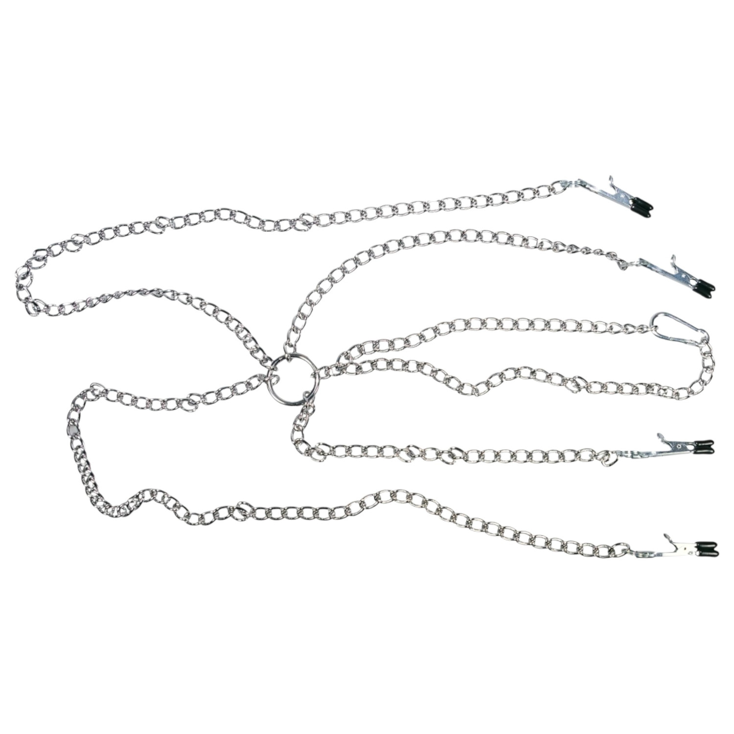 Aseta 3,5 cm läbimõõduga rõngas rindade vahele ja kinnita sinna külge kaelakett, mille saad kaela ümber kinnitada karabiiniga. Rindade ahelad kinnita nibudele klambritega, pikemad ahelad sobita häbememokkadele - nii saad võimsa ja domineeriva tunde kogu kehale.