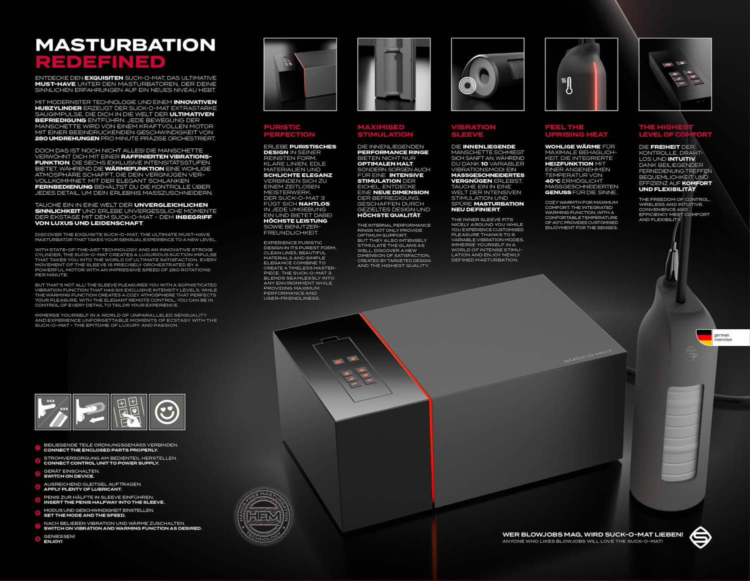Suck-O-Mat 3.0 on elektrivõrguga töötav, täiesti automatiseeritud masturbaator, mis pakub realistlikku oraalseksi tunnetust. Sellel on 100% võimsam imemisjõud ja täiustatud mootor võrreldes eelmise mudeliga, lisaks on sellel stiilne ja sportlik disain koos LED-valgustusega.