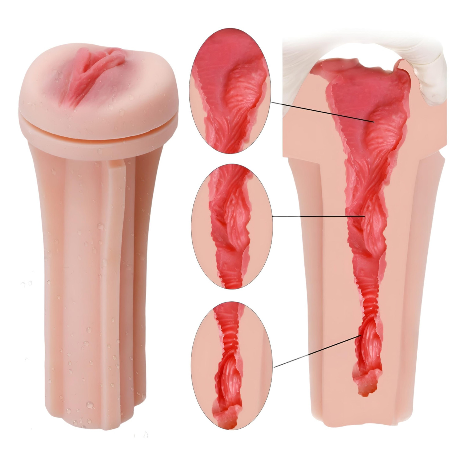 Torka libestatud peenis läbi elutruude häbememokkade realistliku sisemusega tunnelisse. Reguleeri soovitud vaakumit korpuse lõpus oleva õhutusavaga - tänu sellele võid nautida tugevamat imemismõju.