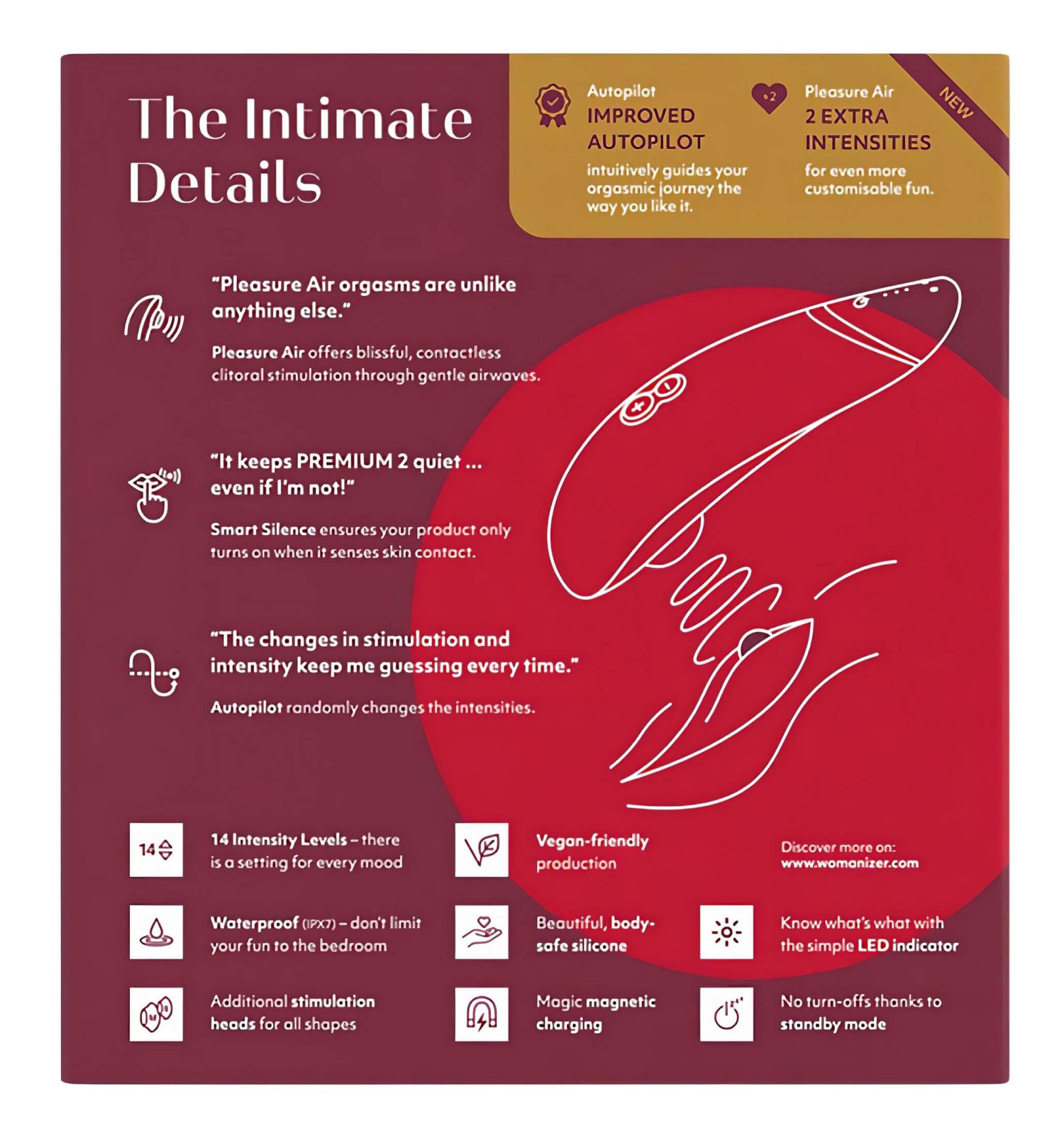 Womanizer Premium 2 ühendab kõige arenenuma õhulainetehnoloogia, Smart Silence funktsiooni ja Autopilot režiimi, et iga kasutuskord oleks ainulaadne ja unustamatu elamus.