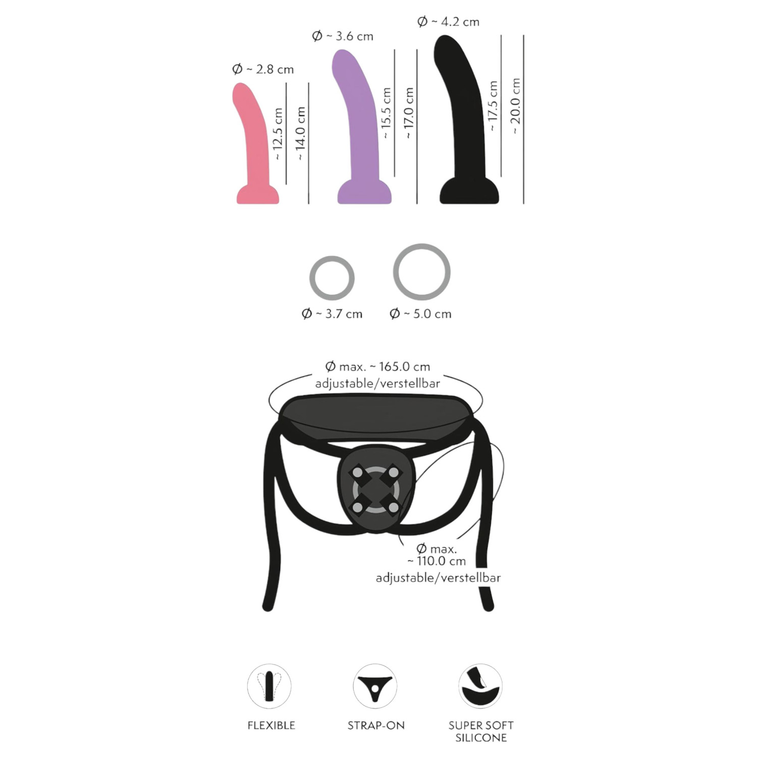 See 4-osaline strap-on komplekt sisaldab kolme vahetatavat dildot (S, M, L) ja reguleeritavat rihma, mis teeb kasutamise eriti mugavaks ja mitmekülgseks.